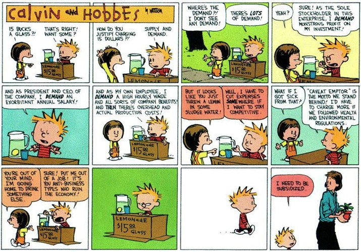 Calvin was, of course, an amazingly ahead-of-his-time capitalist. Who knew back in the 90’s that this form of capitalism would effectively crowd out every other? Now I think we’ve heard from all of the great savants of our time: Fran Lebowitz, George Carlin, Oscar Wilde and the famous and prolific Anonymous, and Calvin.