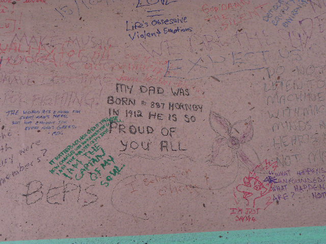 The little “I’m here for you. Are you here for me?” sign at the bottom-right of the “We are not kidding around. Stay a night and talk to us” sign at the top of the steps is the one that was kicked over earlier that afternoon by the chubby, dark security guard, who should have been on the other side of the fence in fact.