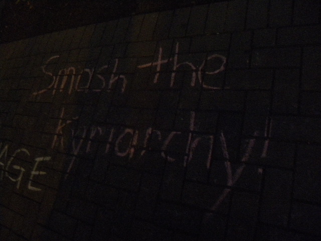 At the VAG there was only one person I saw in an Anonymous mask, but s/he was making the most of it, getting the attention of passing cars. On Twitter there’s been some pushback about the masks and the concept of Lulz in general; people claim that the presence of jokers diminishes the entire movement, but this is getting it absolutely mathematically perfectly bass-ackwards: artists and jokesters are the way radical ideas first begin to integrate themselves into a society. If we got these hard truths from a straight man, we’d get our backs up. Shakespeare knew this when he wrote The Fool into King Lear.