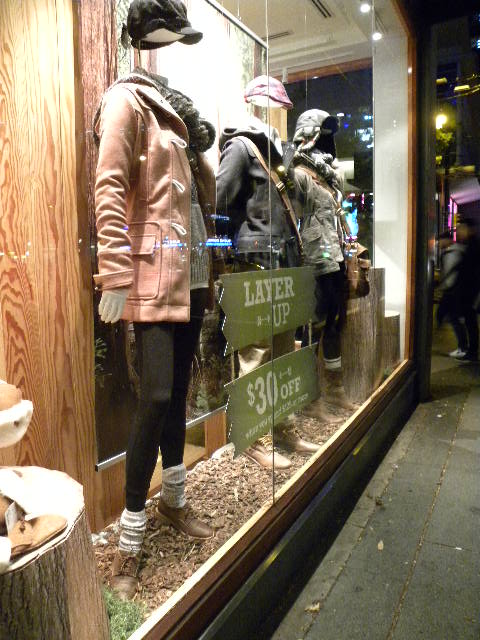 Moving on to Louis Vuitton. Does anyone besides me remember when they had a window display made of dozens of silver CCTV cameras focused on one pair of $1100 shoes? No? Just me then? FINE! In any case, the 1% are, as you can see here, safely confined behind bars as if in a zoo, and if Alberni is not a zoo, what IS? I ask yez. Especially on a Saturday night.