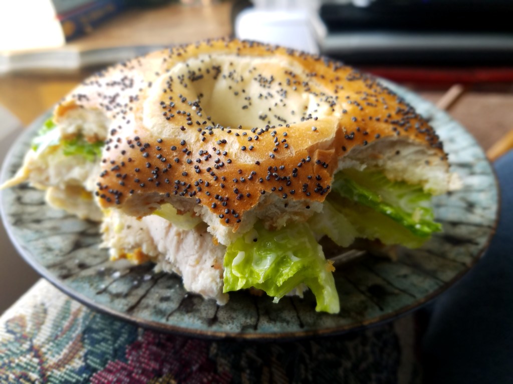 That is leftover cold chicken on a toasted poppyseed bagel with mustard (the basic bitch kind), mayonnaise, and salt and pepper. And it was orgasmic. And about eight hours later I can still smell the chicken on my fingers, and I’ve washed my hands four times.